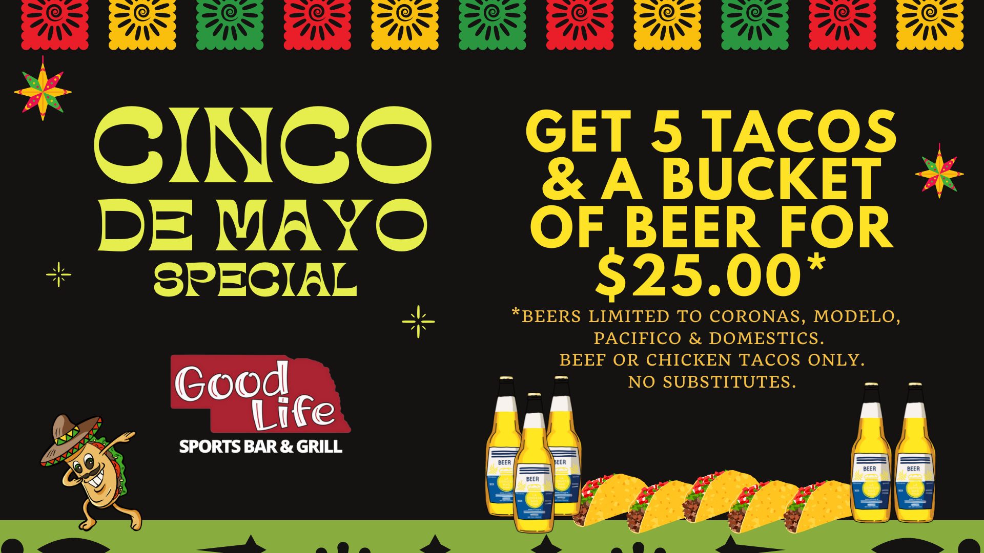 Cinco De Mayo – 5 Tacos & A Bucket of Beer (5) for $25